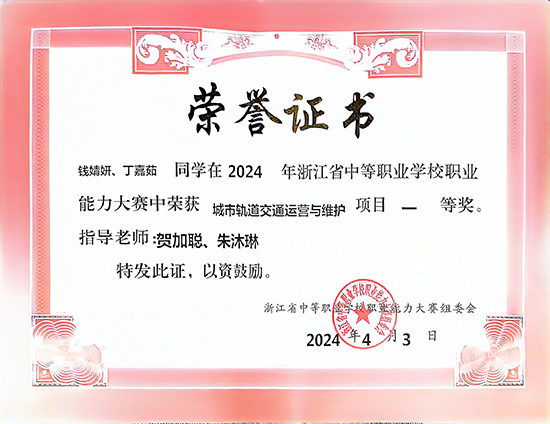 4月3日,2024年浙江省中等職業(yè)學(xué)校職業(yè)能力大賽“城市軌道交通運(yùn)營與維護(hù)”賽項(xiàng)在浙江機(jī)電職業(yè)技術(shù)學(xué)院舉辦,嘉興市交通學(xué)校(嘉興交通技工學(xué)校)21城軌(1)班的丁嘉茹、錢婧妍同學(xué),憑借良好的職業(yè)素養(yǎng)、扎實(shí)的專業(yè)功底和精湛的技藝,一路披荊斬棘,斬獲了一等獎(jiǎng)(第一名)的好成績,拿到了國賽入場券。這是嘉興市交通學(xué)校學(xué)生首次參加該賽項(xiàng)的省賽,也是嘉興市首次入圍該賽項(xiàng)的國賽。