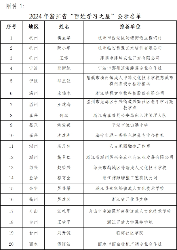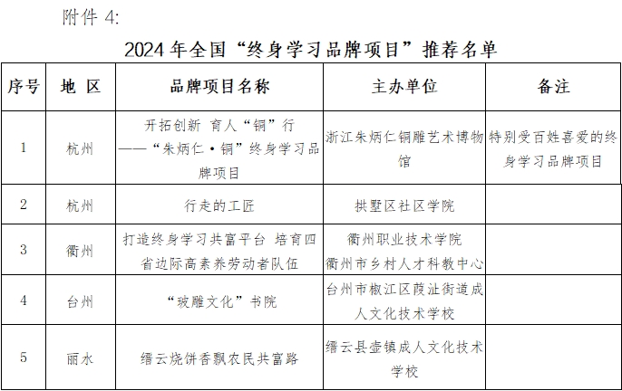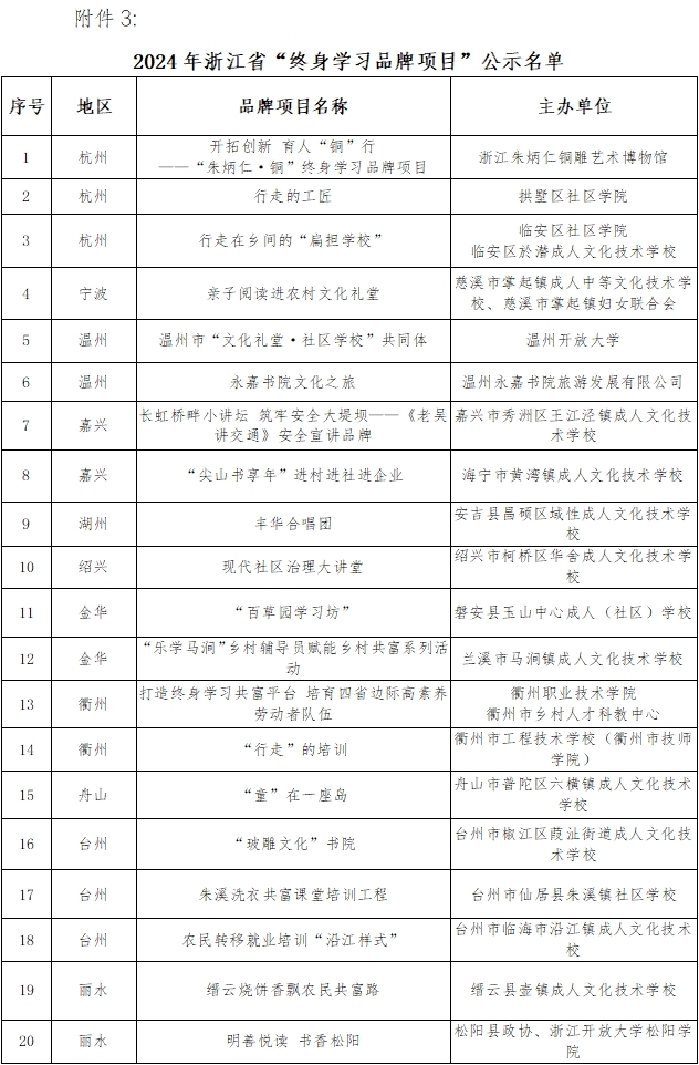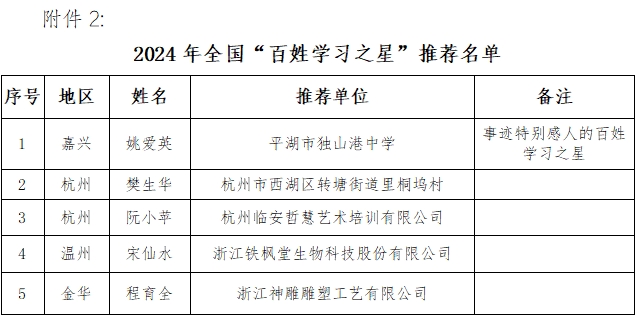 根據中國成人教育協會《關于做好2024年全國新時代“百姓學習之星”和“終身學習品牌項目”宣傳推介工作的通知》和浙江省成人教育與職業教育協會《關于征集2024年浙江省“百姓學習之星”“終身學習品牌項目”的通知》文件要求,經各設區市教育局、各設區市職成教協會的遴選推薦,省成職教協會組織專家評審等環節,擬確定樊生華等20人為2024年浙江省“百姓學習之星”,“開拓創新 育人‘銅’行”等20個項目為2024年浙江省“終身學習品牌項目”,其中姚愛英等5人、“開拓創新 育人‘銅’行”等5個項目為全國新時代“百姓學習之星”和“終身學習品牌項目”候選對象,向中國成人教育協會推薦。現將評審結果予以公示。