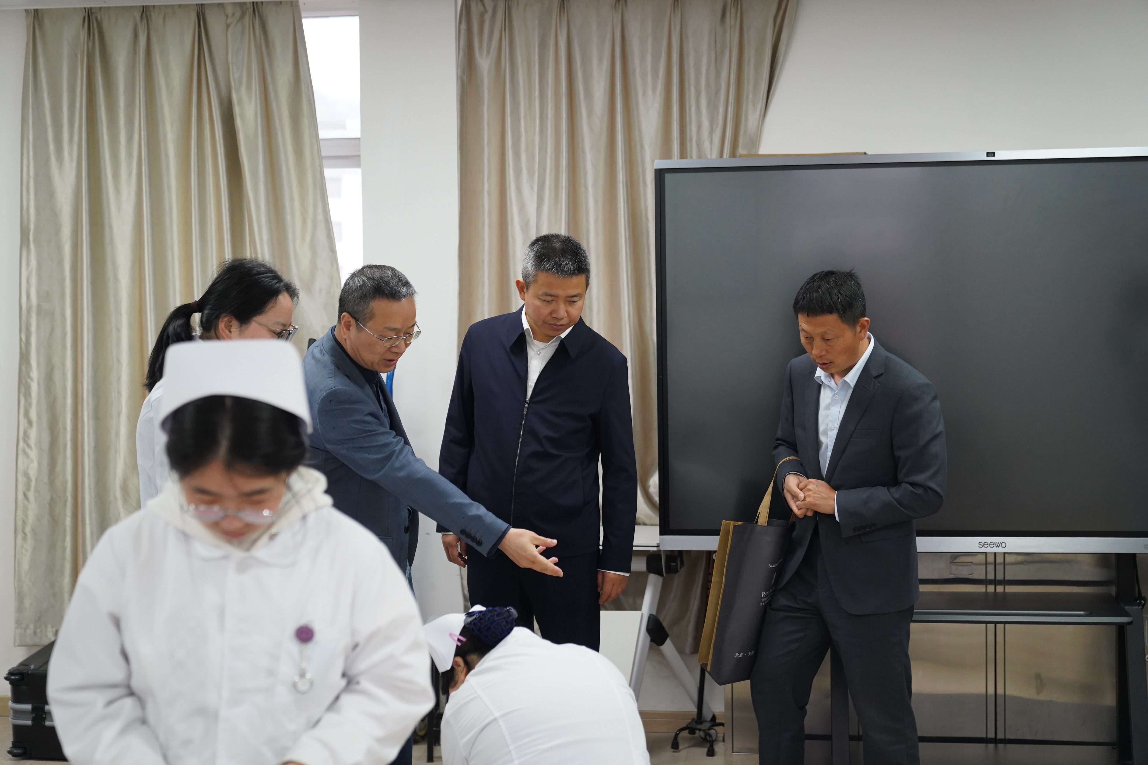 走進護理實訓室,學生們正在進行皮內注射和心肺復蘇訓練,考察團邊走邊看邊問,向同學們詢問技能技法,與大家親切交流學習心得。