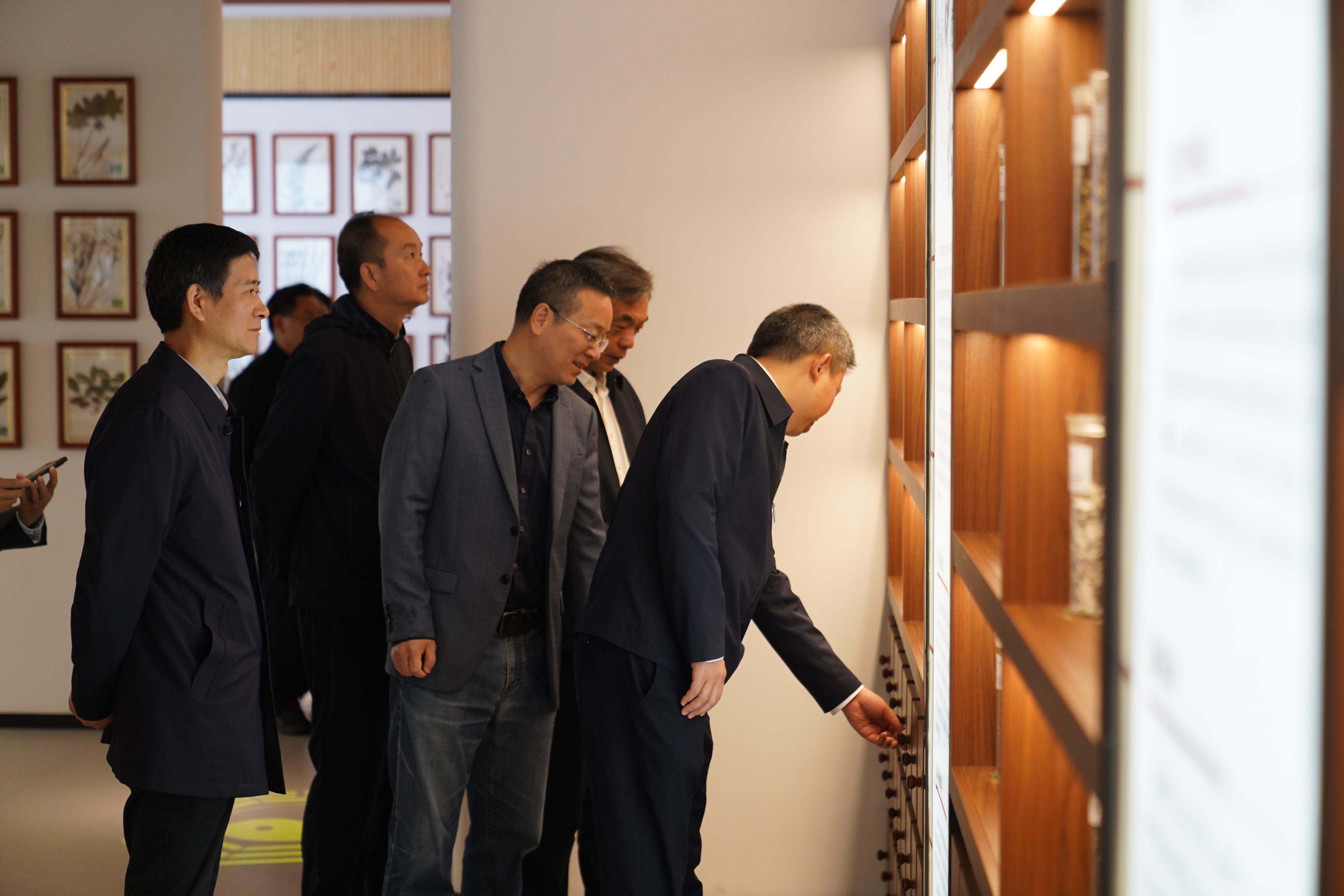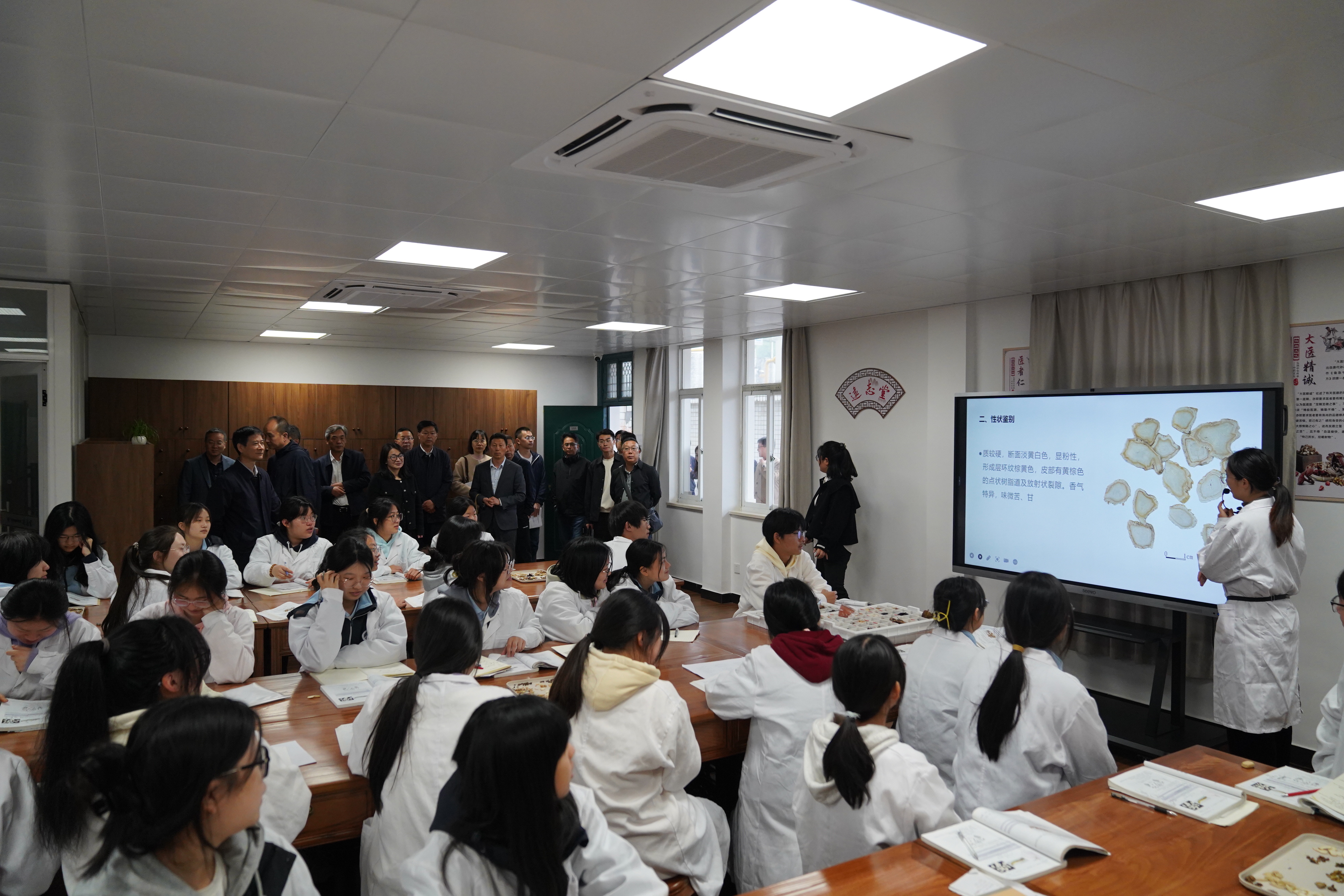 步入中草藥基地,考察團參觀了戶外種植基地和中醫藥陳列館,這里可觀可感的學習環境贏得了考察團的稱贊??疾靾F觀摩了中藥專業學生實踐課堂,了解了中藥專業人才培養、課程設置、產教融合、雙師型教師培養等情況。