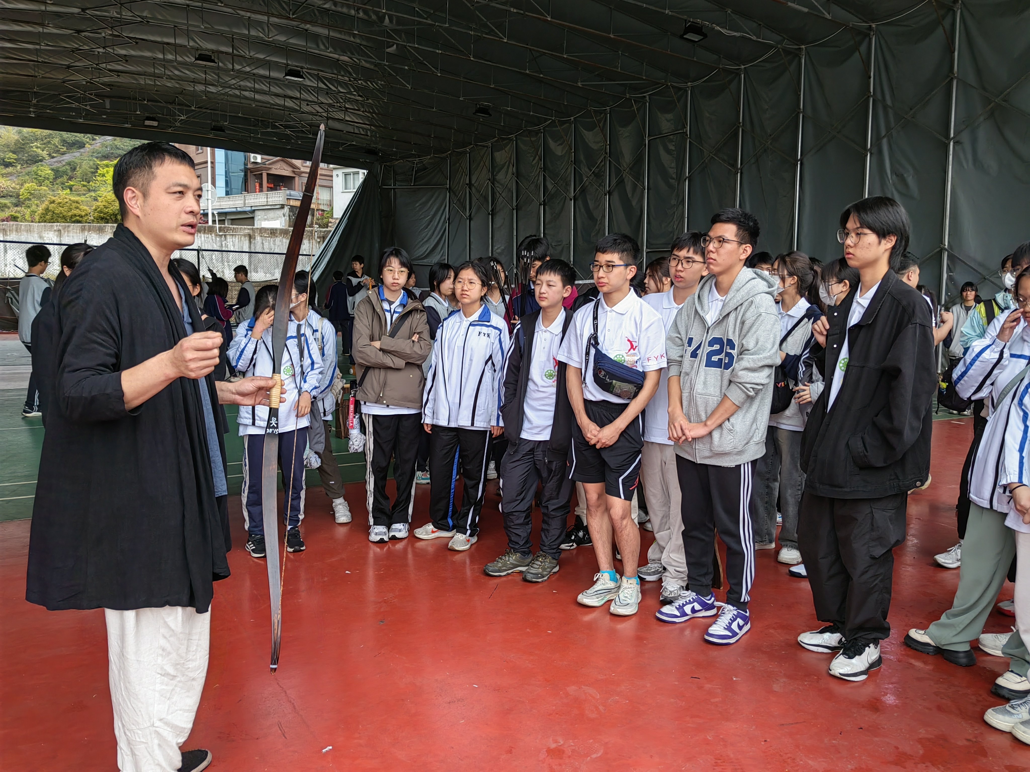 在綜合樓報告廳交流互動之后,香港中國婦女會馮堯敬紀念中學的師生們體驗了中華傳統體育項目——射箭,射箭冠軍吳士全老師介紹了射箭文化的發展史,指出禮樂射御書數為古之六藝,并展示了射禮這一中華禮儀文化。
