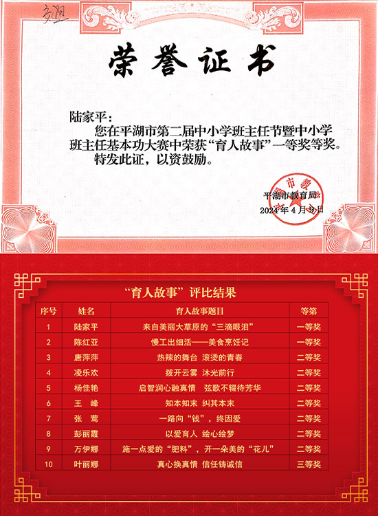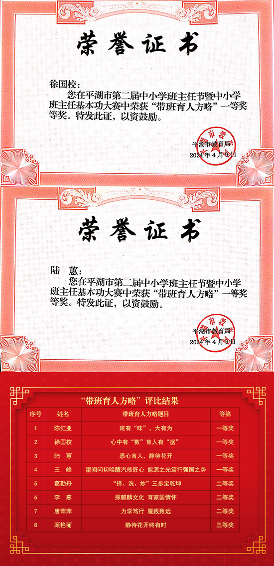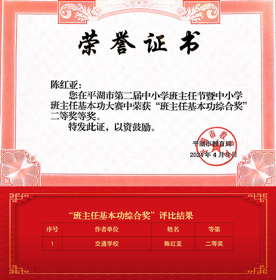 砥礪奮進勤耕耘,碩果芬芳佳績傳,近日,平湖市教育局公布了平湖市第二屆中小學班主任節暨中小學班主任基本功大賽評比結果,嘉興市交通學校(嘉興交通技工學校)教師在“精品班會”“帶班育人方略”“育人故事”比賽中喜獲8個一等獎、12個二等獎、2個三等獎,陳紅亞老師獲班主任基本功綜合二等獎!