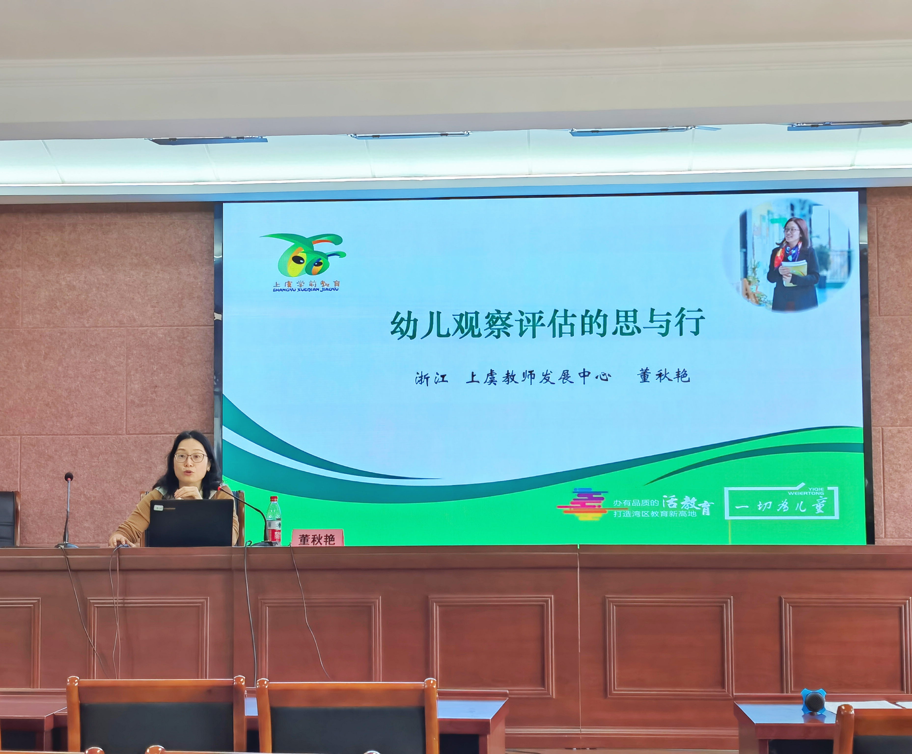 紹興市上虞區教師發展中心副主任董秋艷為大家帶來了以《幼兒觀察評價的思與行》為主題的專題講座。董老師依據兒童發展的目標、教育政策等,運用詳實的案例從多角度解析幼兒觀察評估的價值與現狀。從幼兒日常出發,落實到幼兒的自主游戲,給老師提供幼兒觀察和評價的多維角度。