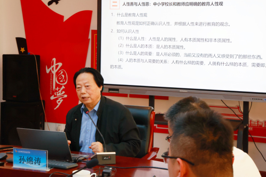 二級教授博士生導師、浙江外國語學院特聘教授、教育治理研究中心主任孫綿濤作了題為《中小學校長和教師應明確的現代教育教學觀》的講座。孫教授強調研究該問題的重要性與必要性,并具體闡釋廣義與狹義的教育觀、人性善與人性惡、全面發展與自由發展、學生中心與教師中心、知識與知識觀、自主學習與被自主學習等八點中小學校長和教師應明確的現代教育教學觀。