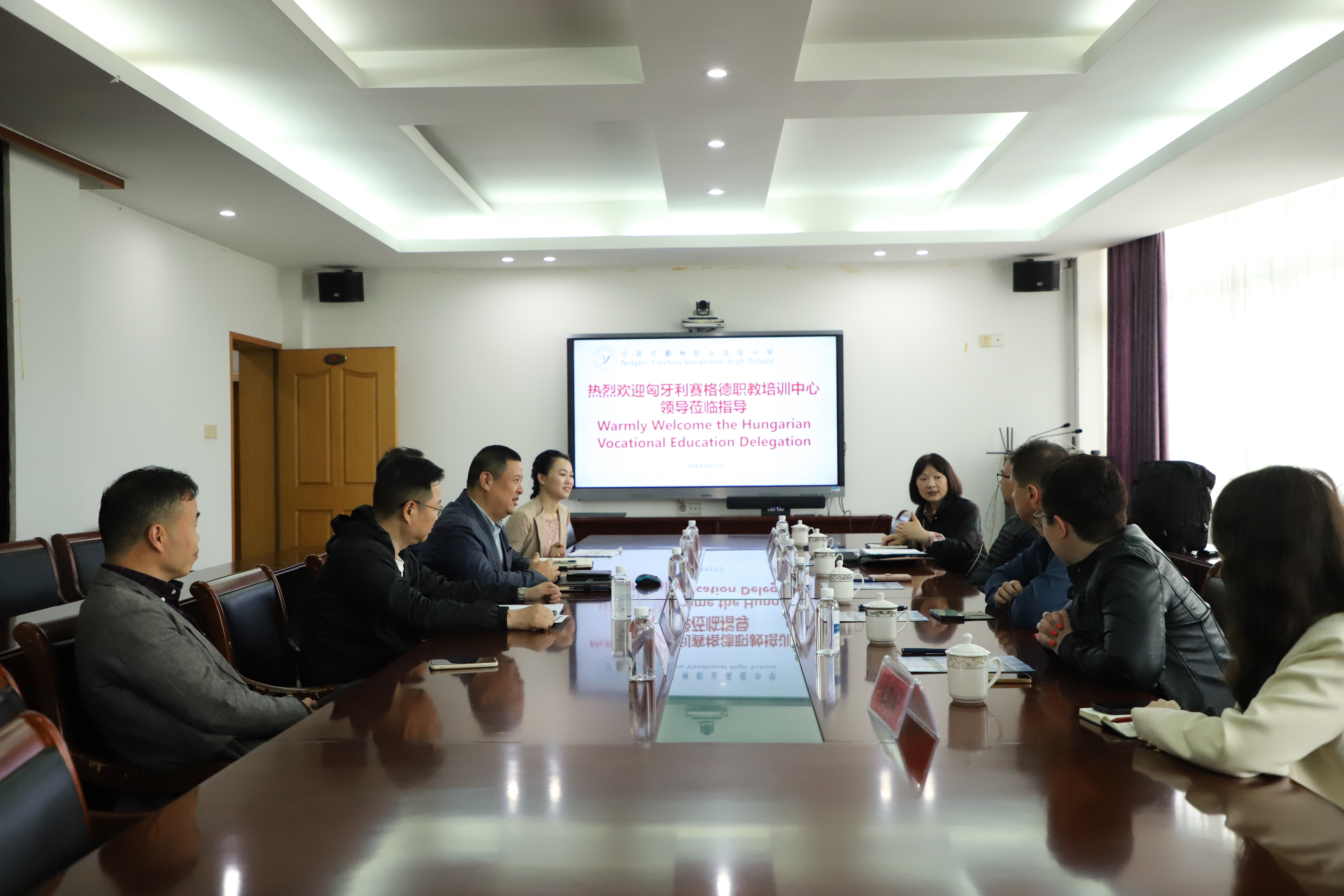 首先,匈牙利教育考察團(tuán)與學(xué)校相關(guān)負(fù)責(zé)人在行政會(huì)議室進(jìn)行交流。會(huì)上,鄞州職高校長張武劍對(duì)居貝爾•馬爾塔副主任一行的到來表示熱烈歡迎,介紹了學(xué)校的相關(guān)情況、專業(yè)建設(shè)情況和新校區(qū)規(guī)劃,并表示希望遠(yuǎn)道而來的客人今后有機(jī)會(huì)能夠來到學(xué)校的新校區(qū)參觀交流。周宇洋老師擔(dān)任本次會(huì)議的翻譯。