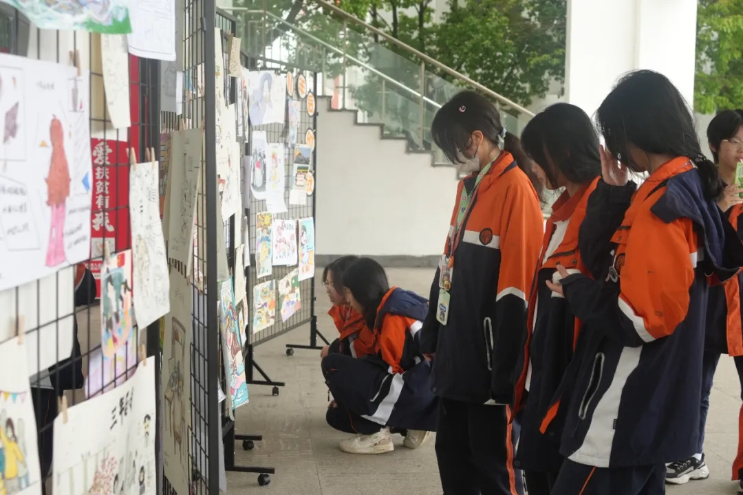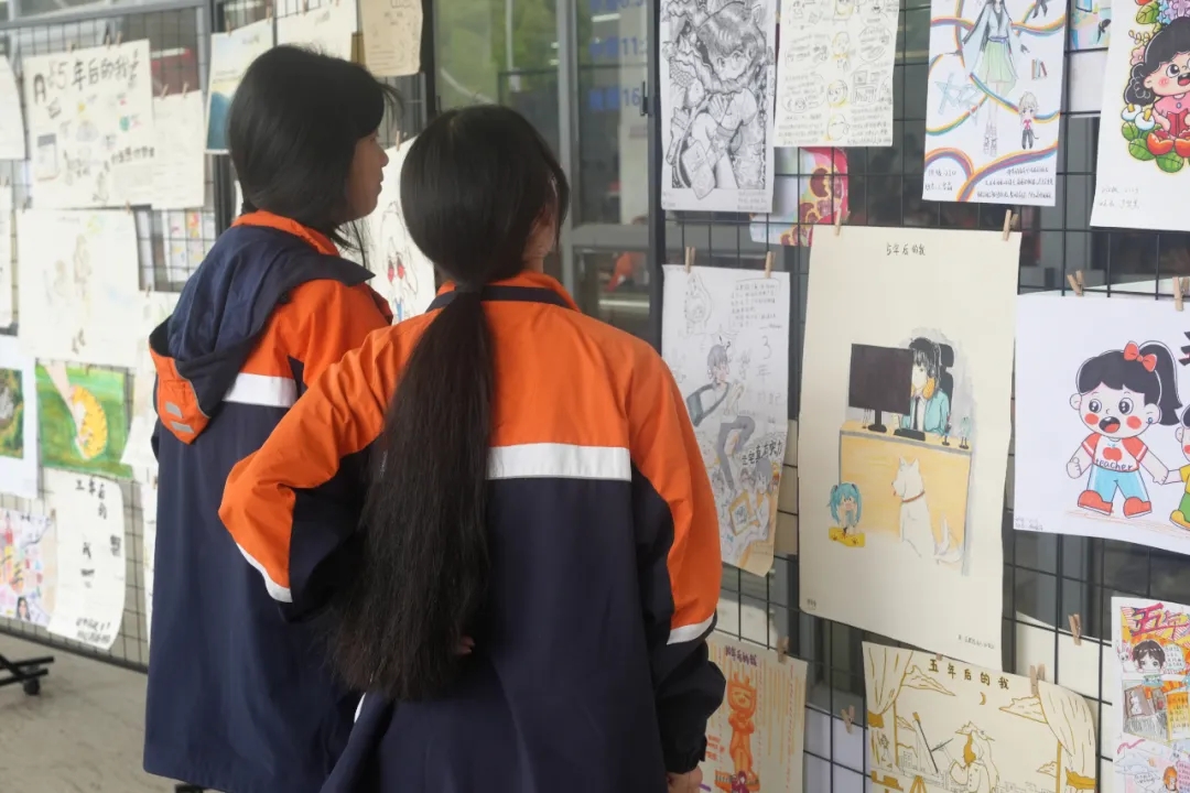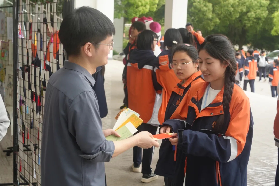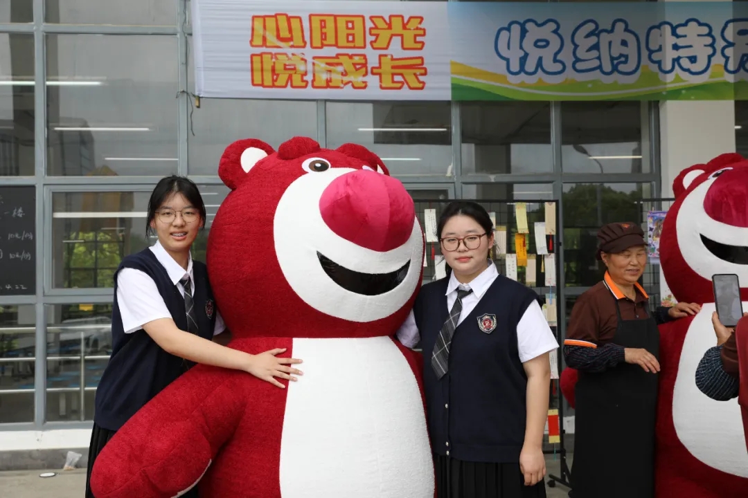 中午,“N年后的我”繪畫涂鴉活動的優秀作品向全校師生進行展覽,同學們紛紛駐足賞析,時不時為創作者的靈感而驚喜,也為同伴的夢想而感動。滿含學生期許的“時空對話”書簽,字里行間流動著滿滿的能量,對未來的美好憧憬,一張張飽含心意的書簽由心理委員贈送給前來閱覽的學生,完成能量的傳播和夢想的接力。吉祥物草莓熊成為了流量密碼,她們的大方熱情,和學生的一次次擁抱溫暖而深情,治愈人心。