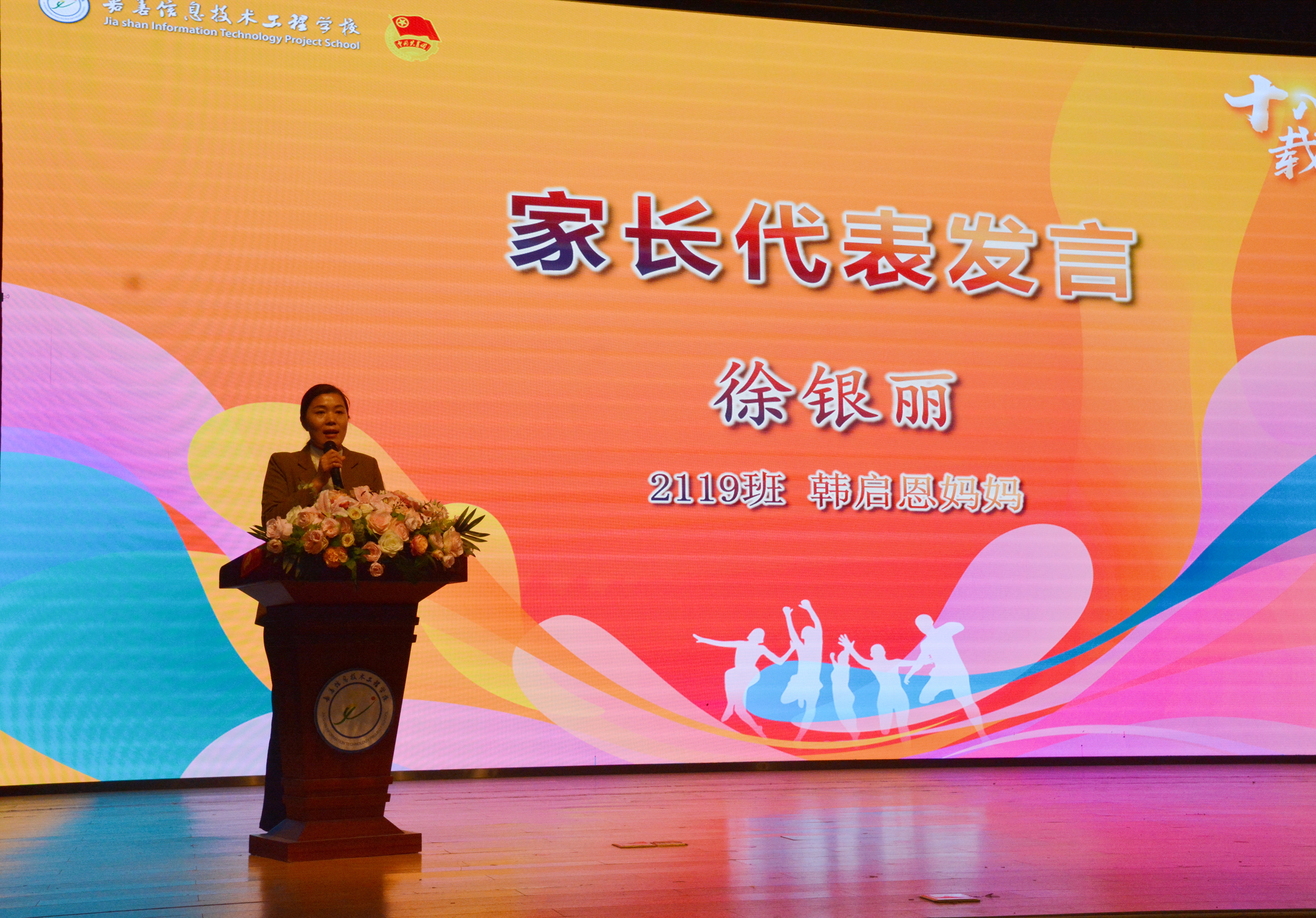 2119班韓啟恩母親徐銀麗作為家長代表發言,她向學校表達了由衷感謝,向同學們步入成年表示祝賀,她寄語同學們全力以赴沖刺高考,以優異的成績回報母校。