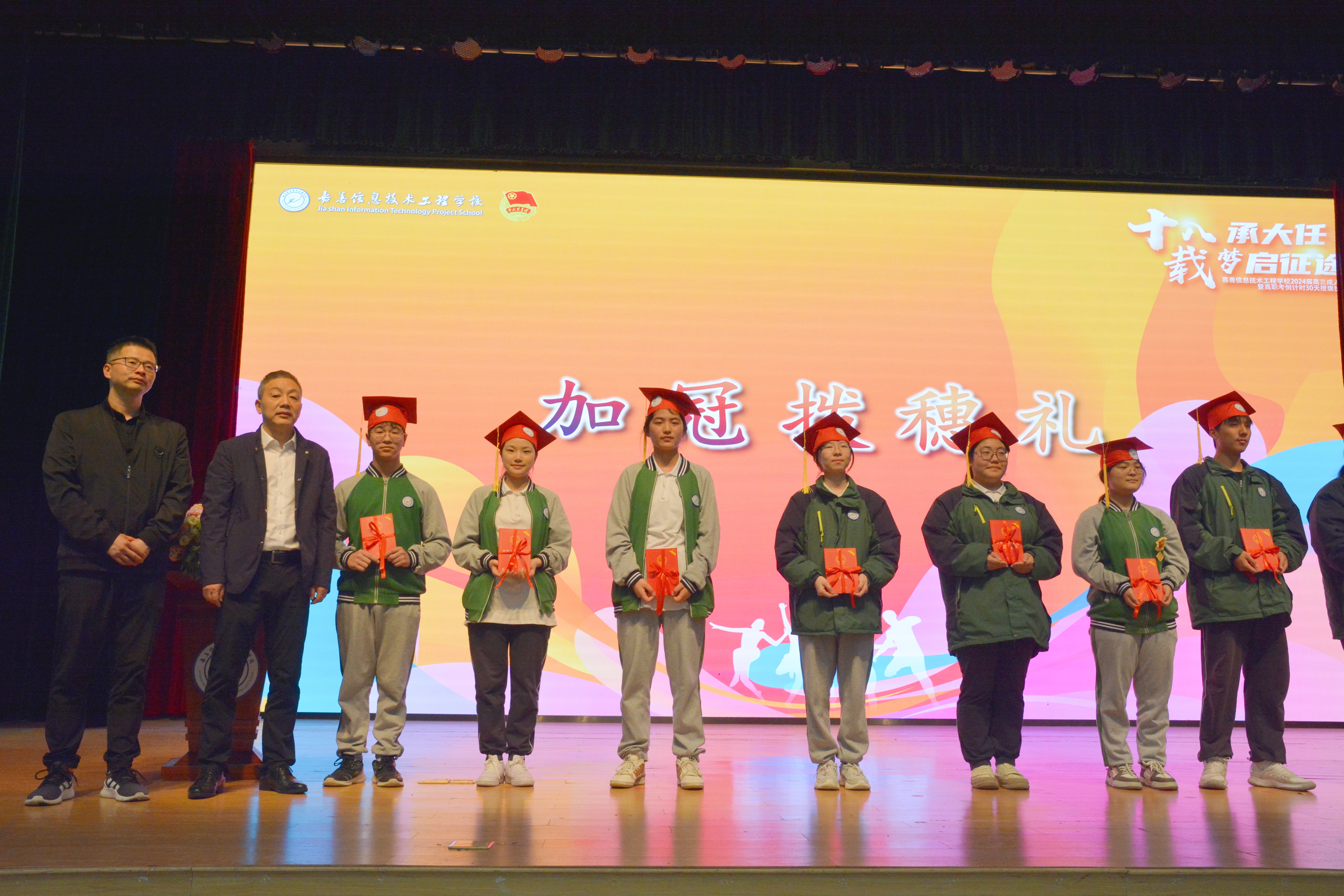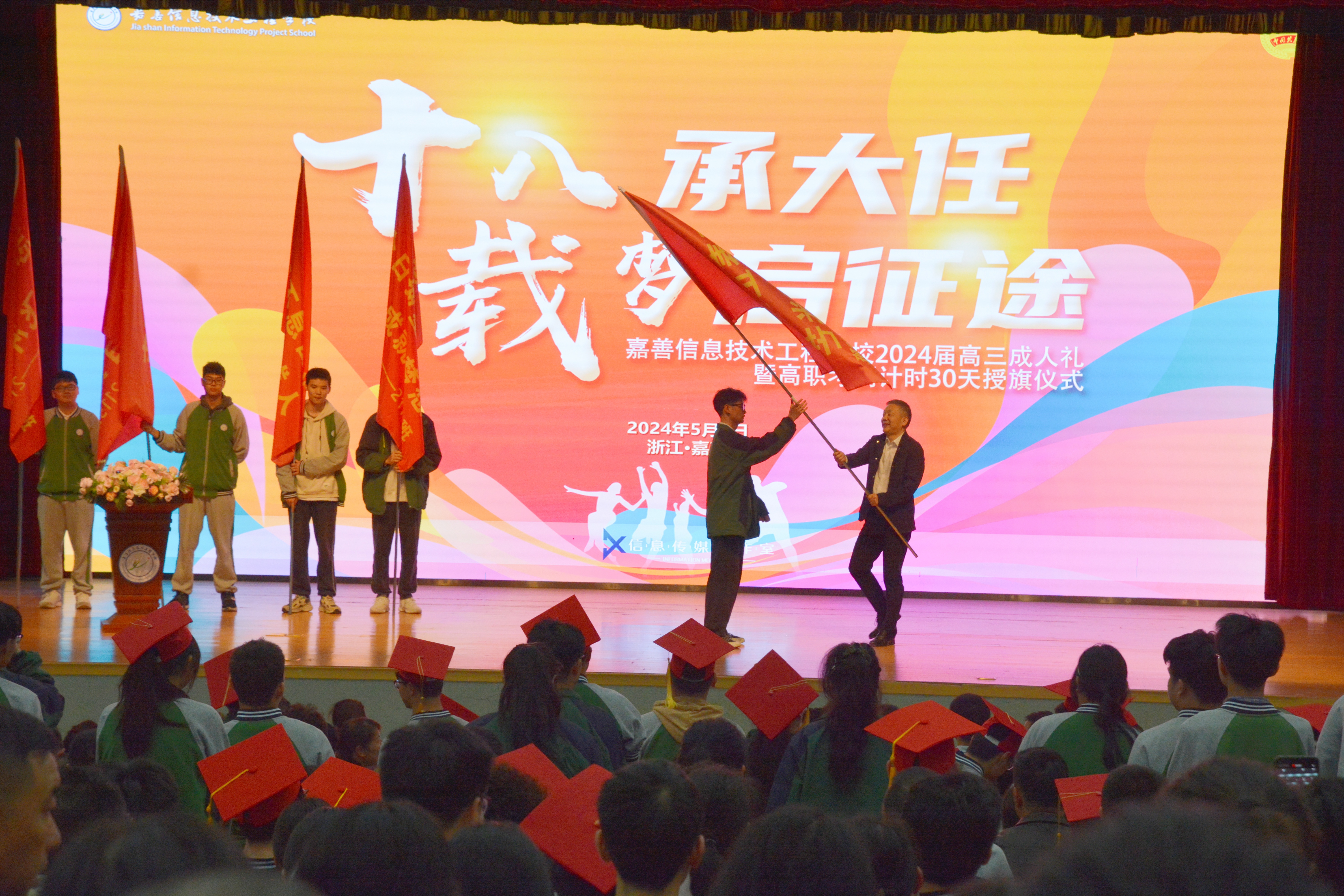 5月4日上午,嘉善信息技術工程學校2024屆高三成人禮暨高職考倒計時30天授旗儀式在嘉善信息技術工程學校大報告廳隆重舉行。學校黨總支書記陳偉紅,學黨總支副書記、校長徐晉謙,副校長沈灝、沈文慧,副校級干部倪林海等出席活動。2024屆高三師生及部分學生家長參加活動,共同慶祝高三學子成人成才,為即將到來的高職考加油助威。活動由高職年級部主任董艷陽主持。