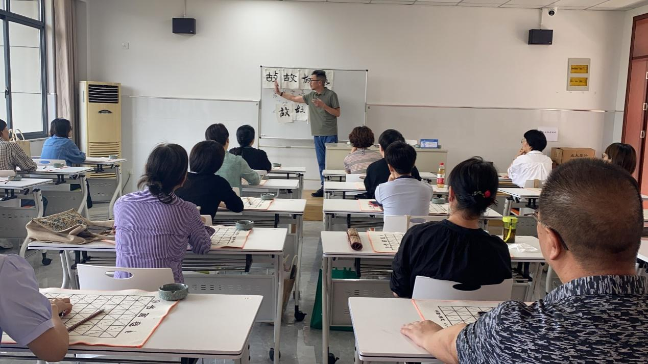 授課老師運用通俗易懂的語言向書法愛好者講解了寫字與書法的區(qū)別、書法的概念和演變、書法的發(fā)展流派和風格等知識,重點教授了執(zhí)筆姿勢、字體結(jié)構(gòu)并現(xiàn)場示范教學,對書法愛好者書法習作進行了點評,指出了存在問題和改進方法。授課老師精湛絕妙的書法技藝,深入淺出的講解和直觀生動的示范,讓書法愛好者們領(lǐng)略了書法的獨特魅力。