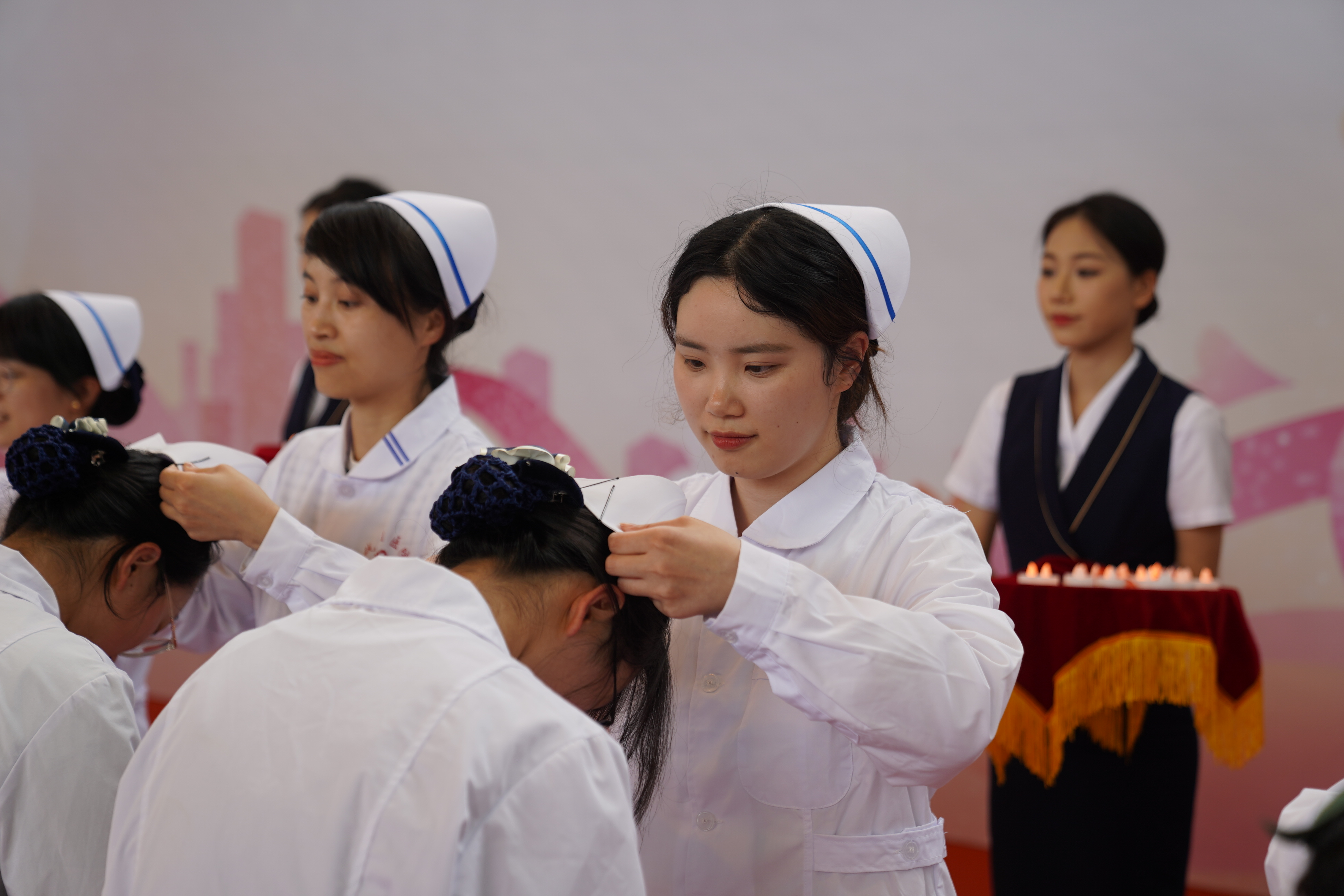 燕尾帽也叫護士帽,是護士的工作帽和護理職業的象征。現場,護理專業同學們輪流上臺,半蹲于老師和護師們面前,接受前輩授帽。隨后,大家接過前輩們手中的白燈,象征愛的傳遞、生命的承諾。