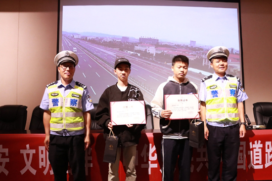 此外,楊學景和張會統兩位警官還為市中等職技校蔡曜蔚、黃友濤兩位同學頒發了“交通安全衛士”榮譽證書,表彰其積極勸阻他人交通違法、維護交通安全秩序的行為。
