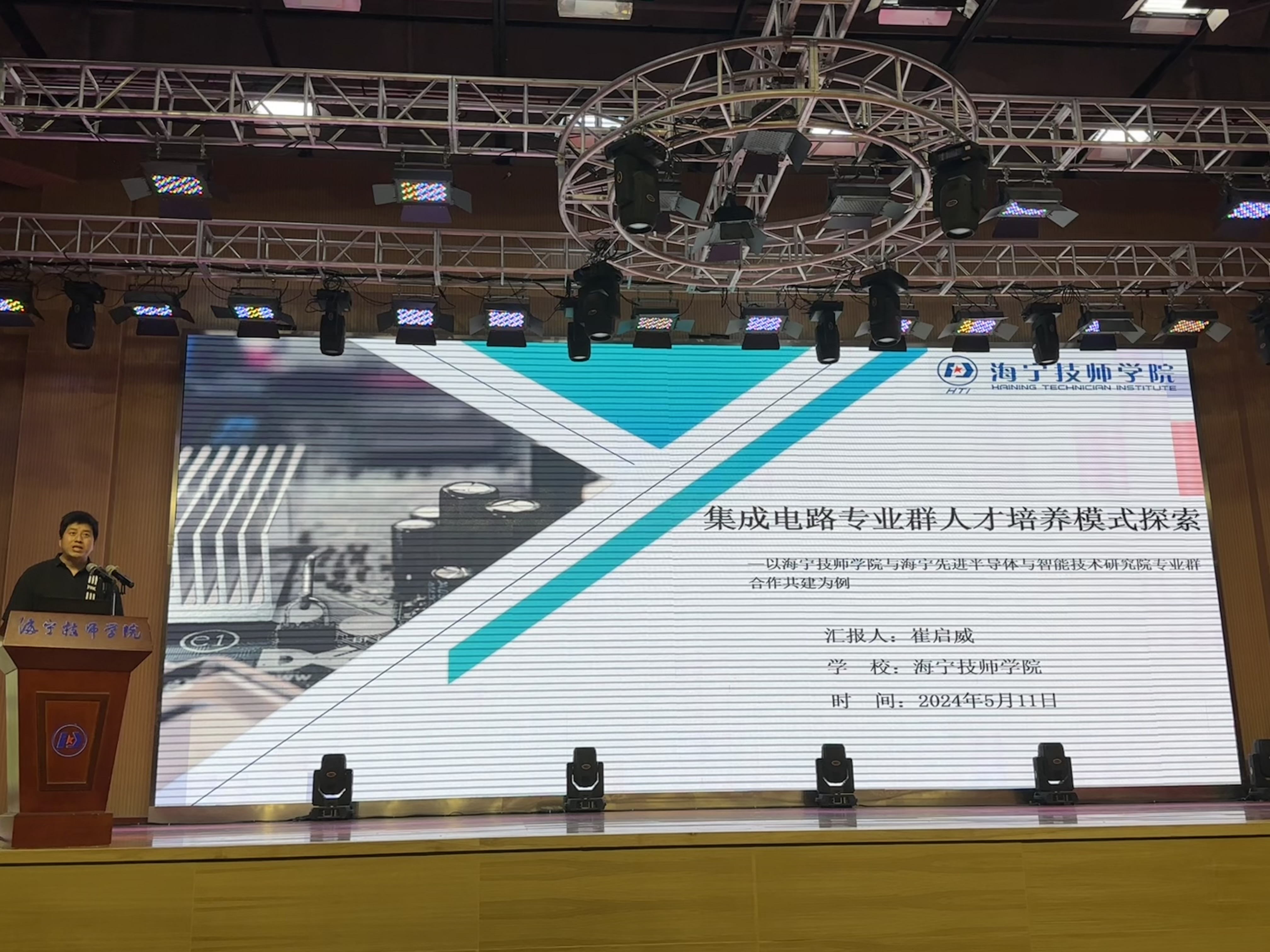 在人才培養模式探索環節,海寧技師學院智能制造系副主任崔啟威圍繞“集成電路專業群人才培養模式探索”詳細匯報了海寧技師學院與海寧先進半導體與智能技術研究院合作共建案例匯報。他強調了產教融合的重要性,并介紹了雙方合作在人才培養、科研創新等方面取得的豐碩成果。
