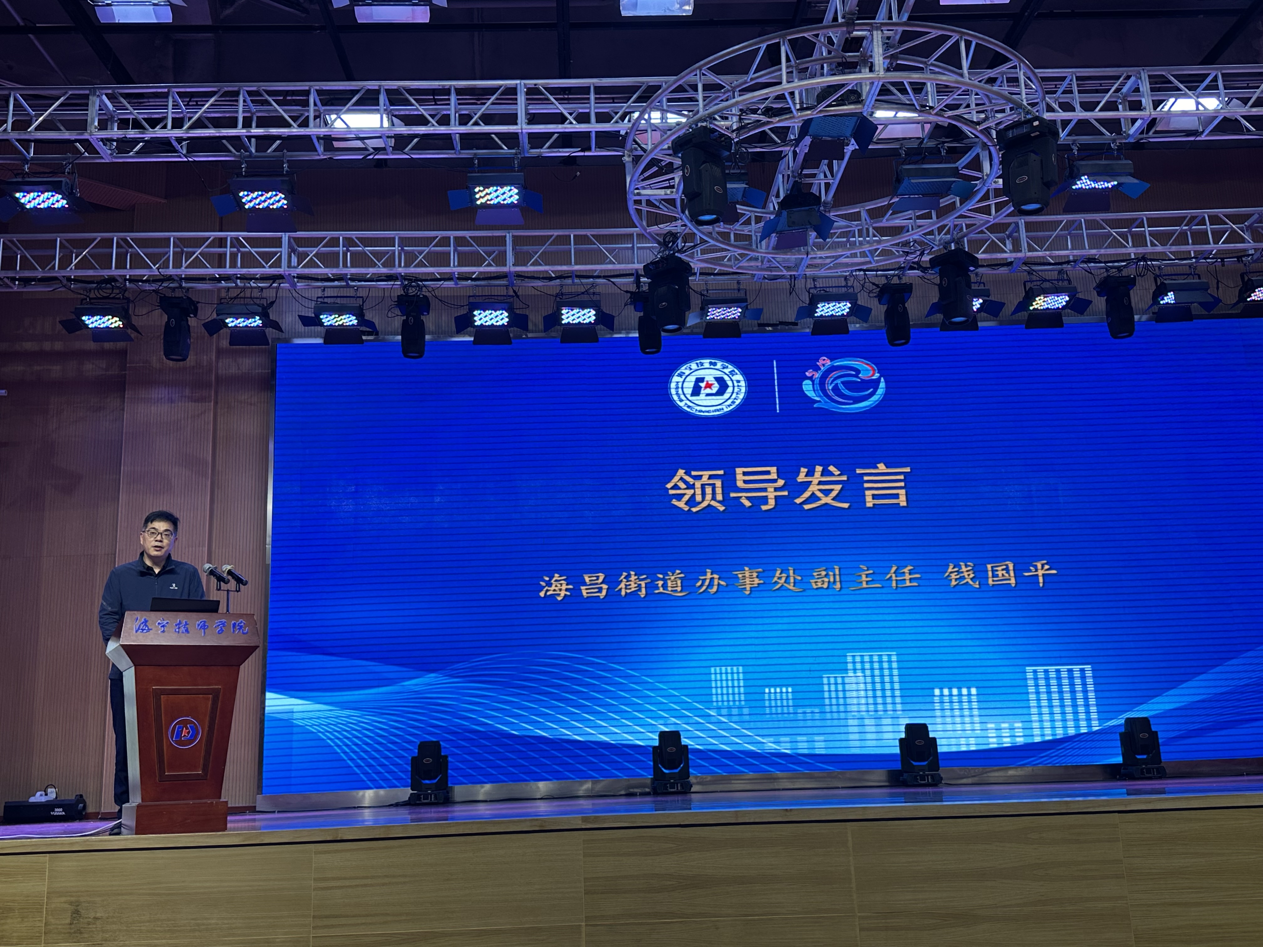 活動的高潮部分,海昌街道辦事處副主任錢國平發表了講話。他對學院在職業教育領域取得的成就表示贊賞,并希望未來能夠繼續加強政校企行合作,共同推動區域經濟發展。