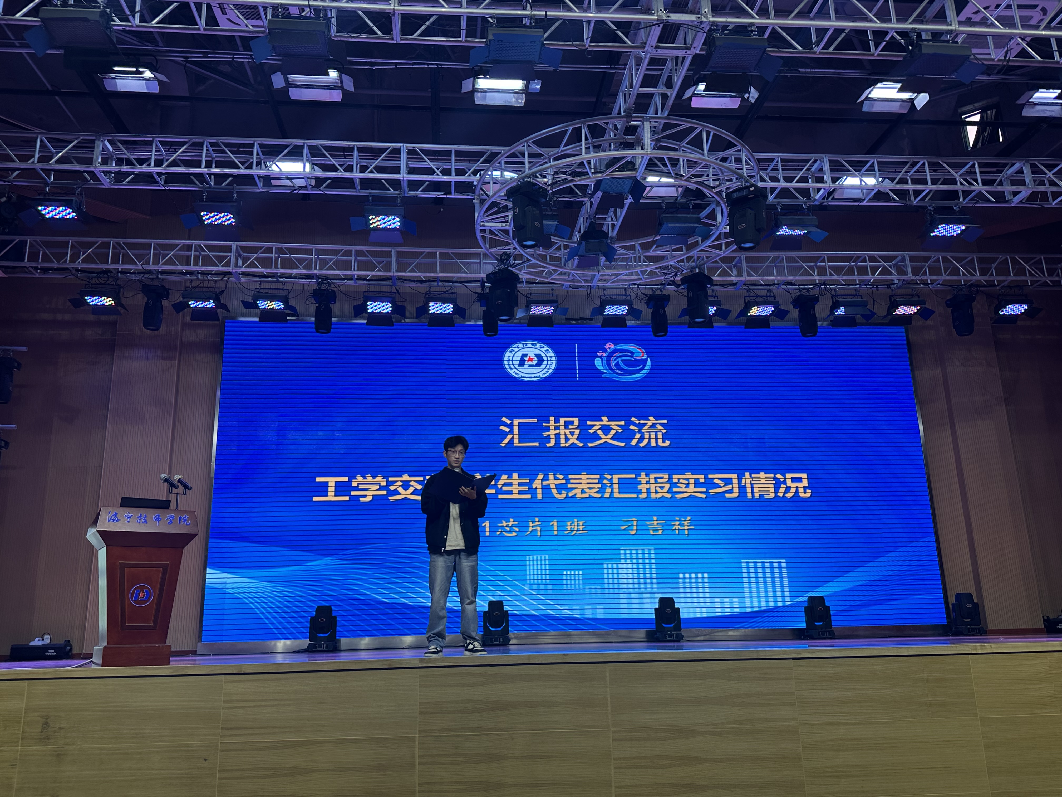 在匯報交流環節中,工學交替班級學生代表21芯片1班刁吉祥同學上臺發言,他詳細介紹了自己在實習期間的所見所聞和所學所感。刁同學表示,實習經歷不僅讓他學到了專業知識和技能,更重要的是讓他明白了責任與擔當的重要性。