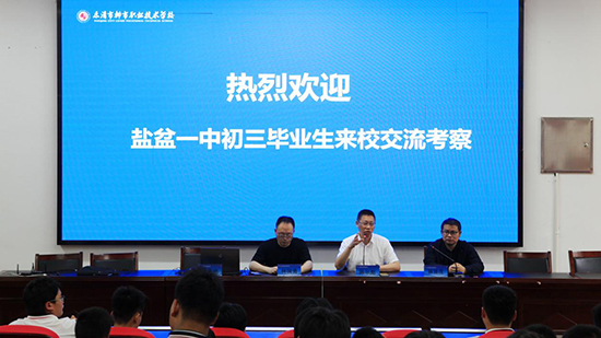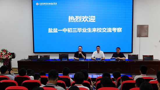 參觀體驗結束后,學生在階梯教室集合參加學校講座。何國勇致辭,對鹽盆一中來校參觀的學生和帶隊老師表示熱烈歡迎。并從學校概況、專業設置、教學特色、培養成果等四個方面進行了介紹。
