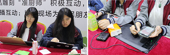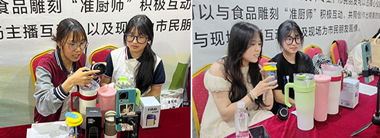 “母親節(jié)送一個溫暖的保溫杯給媽媽,喜歡的朋友們可以點擊下方的小黃車下單哦!”電商專業(yè)的學(xué)生們在屏幕前充滿活力地進行著直播帶貨,所賣的產(chǎn)品也十分吸睛:桌上不同款式的保溫杯是由學(xué)校企業(yè)學(xué)院“飛劍學(xué)院”研究生產(chǎn)的熱門產(chǎn)品,從旅行杯到鈦杯,從普通水杯到保溫杯,不一而足。經(jīng)過兩位電商班學(xué)生的詳細介紹,線上與線下都有不少顧客下單。