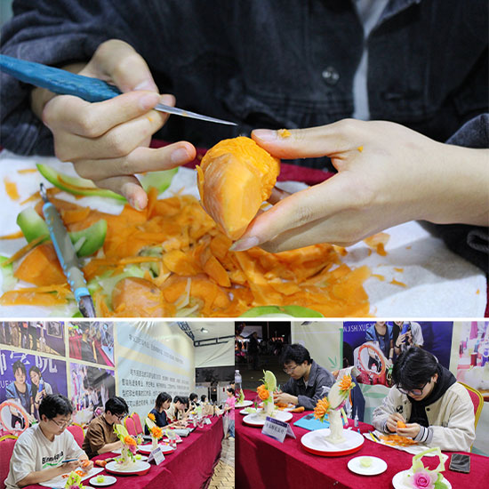 “一刀一錐,靈動魚兒游于股掌;一心一意,食雕之藝綻放精彩。”烹飪專業(yè)的學(xué)生利用各種蘿卜,雕琢出的紫紅色花朵栩栩如生。許多熱愛烹飪的大朋友、小朋友也親自上手體驗了一把制作精美食材的過程。許多游客駐足拍照,在切、刻、雕、接等手法的綜合運用中,學(xué)校學(xué)生與體驗者積極互動,共同創(chuàng)作出了精美的成品。