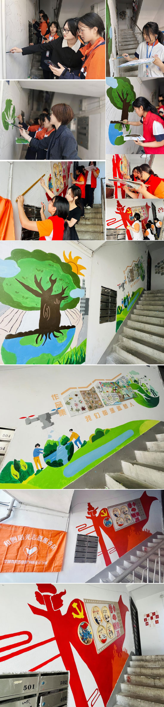 在教師志愿者的協(xié)助下,學生對樓道進行設計、彩繪。從課堂到居民樓,學生志愿者用手中的畫筆和心中的創(chuàng)意把社區(qū)樓道裝點得美觀且富有生氣,讓原本單調(diào)的社區(qū)居民樓道變成了傳播政治思想理念,培育生態(tài)環(huán)保意識的“墻上陣地”。