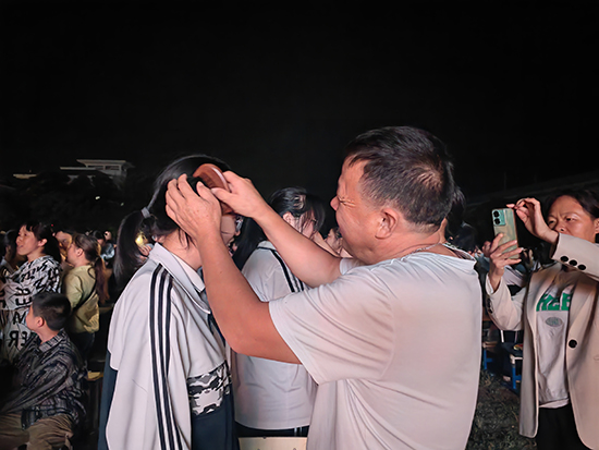 成人禮儀式上,家長們為孩子整理衣冠、梳頭,并親手為他們戴上寓意“金榜題名”的手鏈和成人帽以及送上自己精心準備的禮物。隨后,同學們面向父母,為父母梳頭,送上自己親手寫的一封信,用真摯的文字表達對父母的感激之情,“爸爸媽媽,謝謝你們一直以來對我的支持和鼓勵,是你們讓我學會了堅強和勇敢,讓我有信心去面對未來的挑戰。”一位學生在信中這樣寫道,這些信件,雖沒有華麗的辭藻,卻句句真情流露表達對父母的感激之情。在這最美好最動人的時刻,同學們向父母三鞠躬,感謝父母的養育之恩,最后與父母們緊緊相擁。