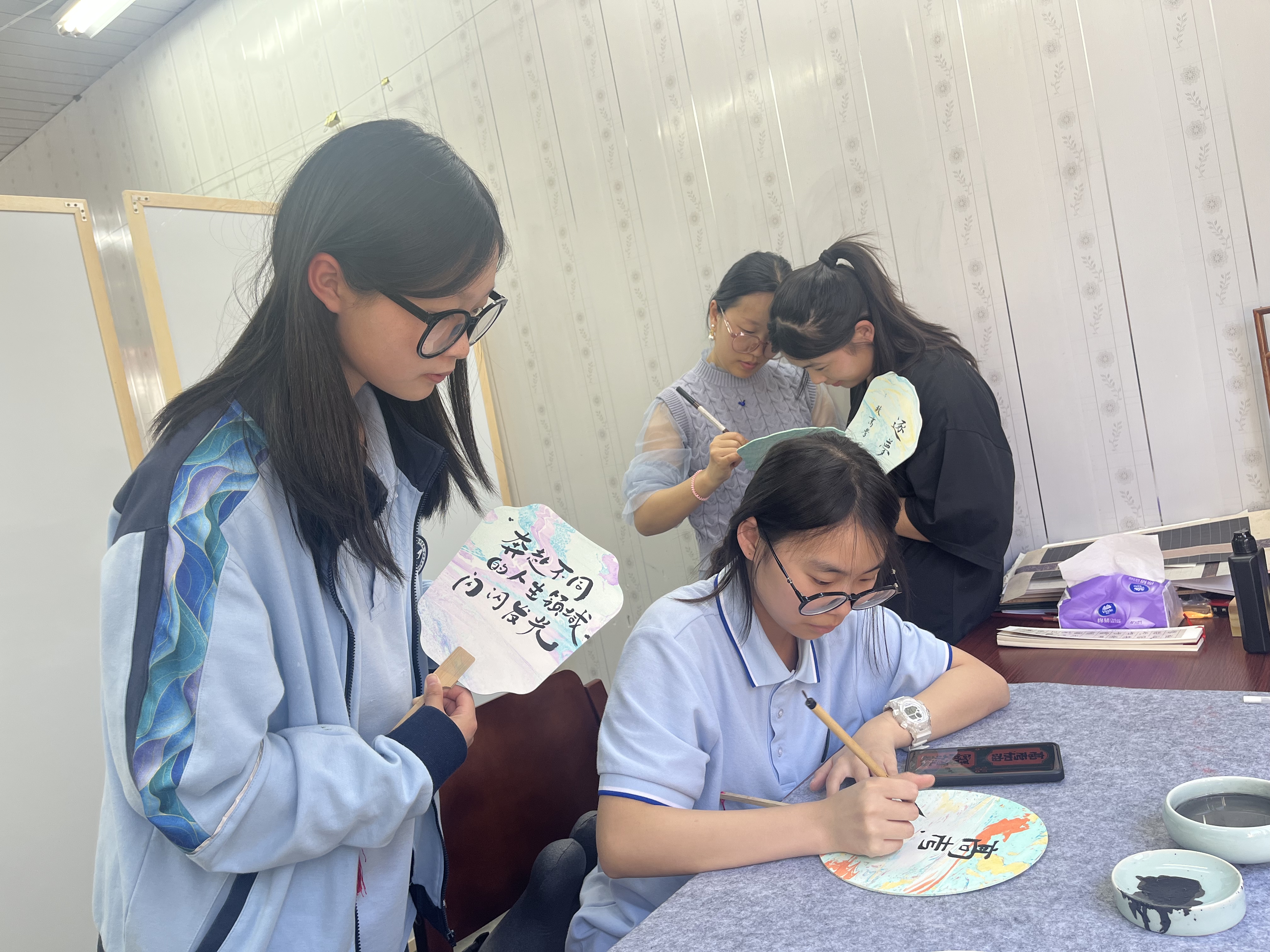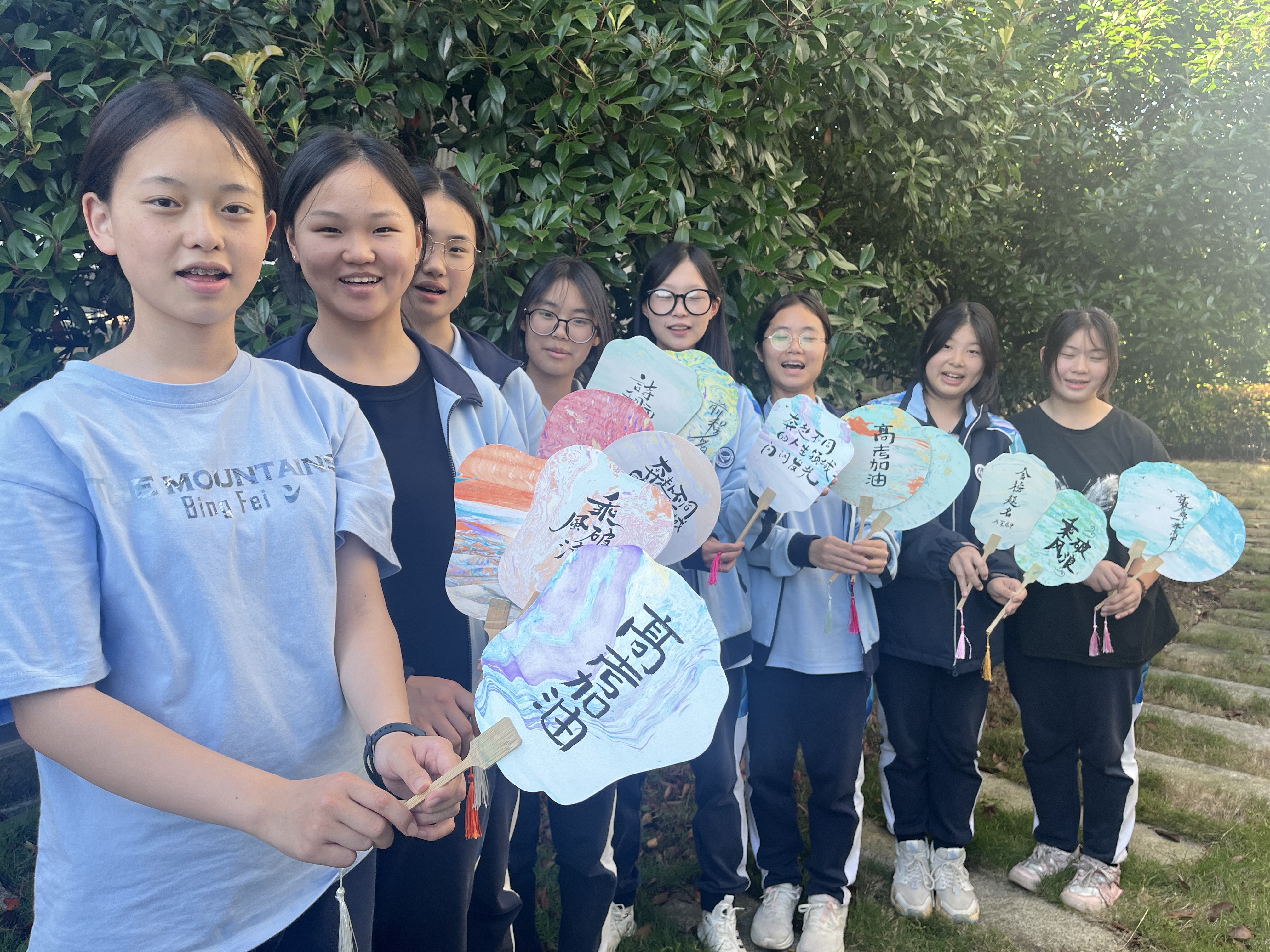 隨后,大家在美術老師洪鈺的指導下,在扇面上寫下祝福語:“乘風破浪”“高考加油”“成為最閃光的自己”,這些書法可謂點睛之筆,仿佛賦予了漆扇蓬勃的生命力。