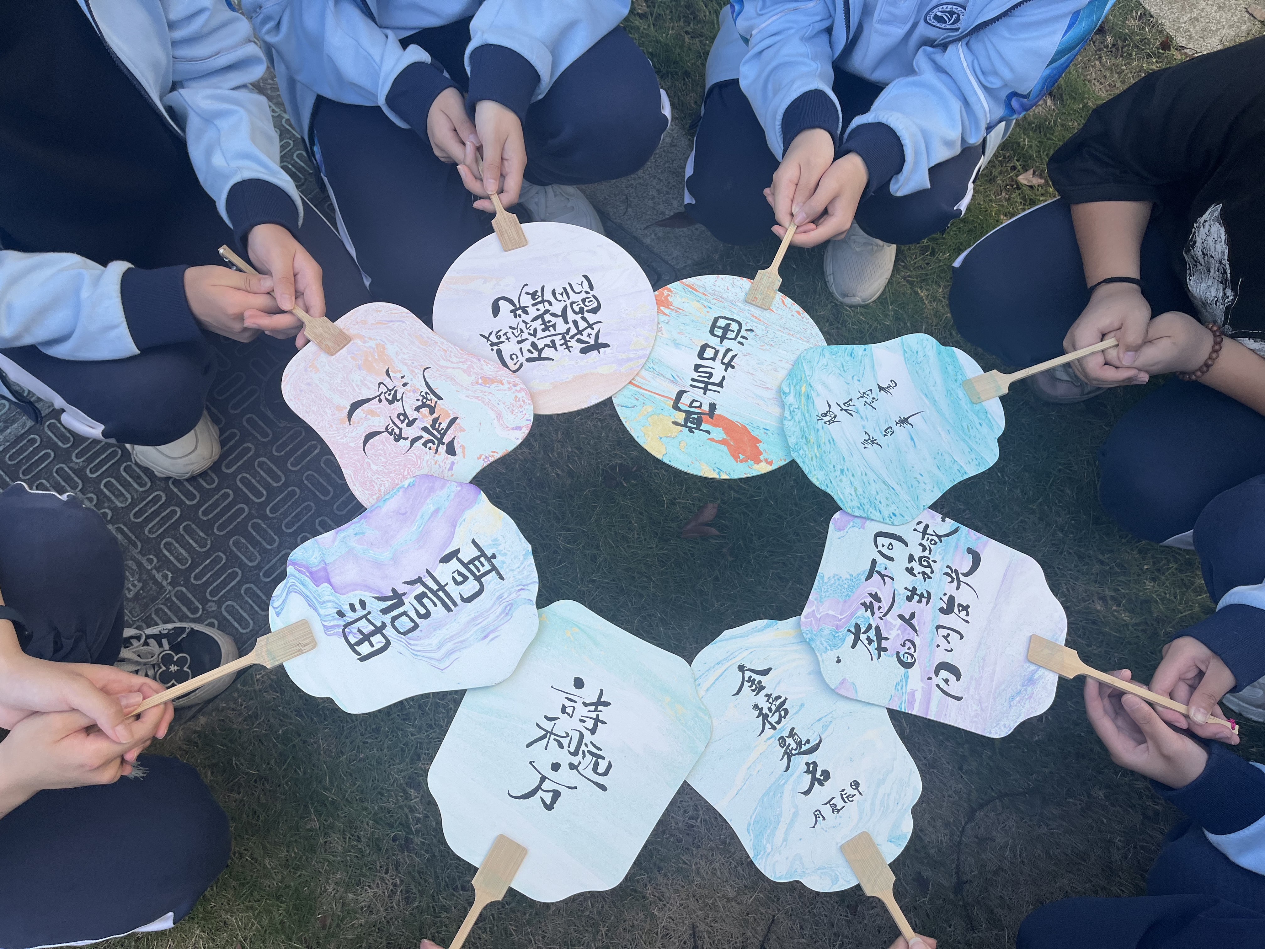 漆扇是一種以天然大漆為主要材料制作而成的扇子,經過涂刷和烘干,每一把漆扇都有獨一無二的美。當天,利用選修課時間,陳巧老師組織同學們親手制作漆扇,大家先準備好容器、清水、鑷子、調色板等,接著將搭配好的顏料滴入水中,通過或攪拌或敲打水面上的漆層,使其形成變化的紋路,這時候,就可以把團扇旋轉入水,并緩緩從從水中取出,此時,扇面上已經呈現出多姿多彩的圖案。