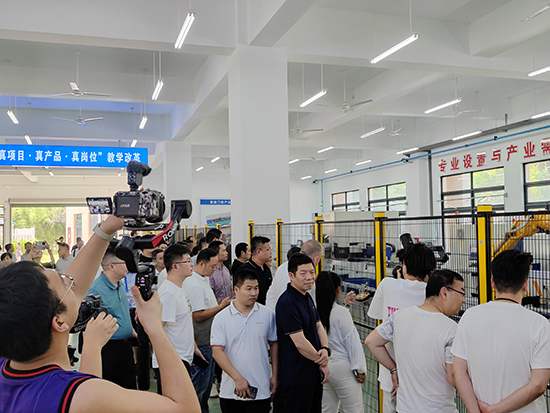 會前,與會人員走進永康五金技師學院產教融合大樓的實訓車間。在學校黨委委員胡贊介紹下,眾人參觀了學校與科普未的校企合作成果“通軸門智能化無人產線”,了解到學校正在探索的“1條真實自動化生產線+1個虛擬仿真中心+N個一體化學習工作站”的1+1+N產教融合模式。