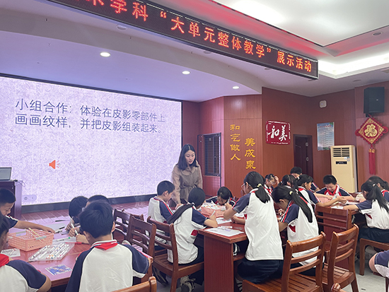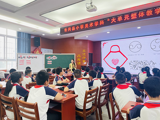 長興美術青改組成員王潔、張穎、端青云、曹俊四位老師在長興縣美術教研員高穎老師的指導下開展美術大單元教學展示活動,通過《剪紋樣》《生肖剪紙紋樣》《衣飾剪紙紋樣》《皮影紋樣賞析》四節課例的展示,不僅讓學生傳承了傳統技藝,還通過陶器、紙盤、肚兜、皮影等載體將剪紙貫穿生活,展望對生活的美好向往。張羽老師以《剪紙悅生活,非遺共傳承》對此次剪紙單元教學設計就大單元的概念與基本問題、單元設計思路、單元目標、重難點以及單元評價進行了匯報。