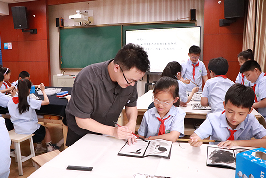 來自陳勇名師團隊的王亞圣、丁玲、顧韻赟三位老師,以國畫為主題大單元展示了《奇石》《彩墨游戲》《水墨人物》的三節課例,課后,陳勇老師從國畫的內容、墨色、用筆、形式、風格、畫家及其思想等國畫單元教學的梳理進行針對性點評。參訓教師對當下美術教材國畫內容中呈現的關注基本知識、技能的共性規律和遷移、系統思維和核心素養的目標達成進行了充分交流。