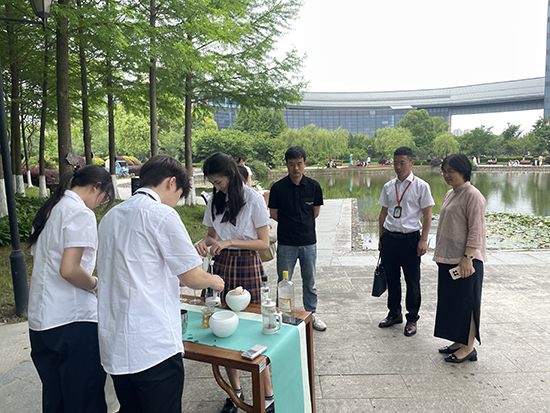 在大學(xué)老師的引導(dǎo)下,同學(xué)們來到了茶藝空間和茶藝教室進行參觀和體驗,其中的選茗、烹茶技術(shù)、茶具樣式和環(huán)境的選擇創(chuàng)造等內(nèi)容讓大家耳目一新,同學(xué)們沉浸式體驗了茶藝與美學(xué)的融合。