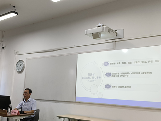 浙江省特級教師陳建新給學員們作專題講座《核心素養落地的策略與建議》。陳老師從新課標的角度出發,用五個案例強調了課程體系與教學內容是核心素養落地的重要載體,學校和教師應依據核心素養的要求,對現有課程體系進行優化調整,確保學科教學能夠緊密圍繞核心素養展開。