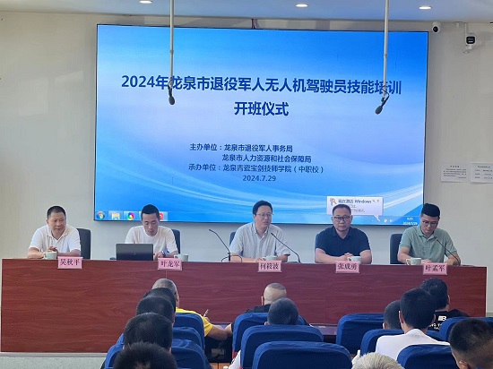 7月29日,由龍泉市人力資源和社會保障局、龍泉市退役軍人事務局主辦,龍泉青瓷寶劍技師學院(中職校)承辦的2024年第一期無人機駕駛員(初級)職業技能培訓班(退役軍人專場)在學校東校區匠馨樓正式開班。龍泉市退役軍人事務局局長何筱波,龍泉市青瓷寶劍技師學院(中職校)黨委書記、校長張成勇,龍泉退役軍人事務局優撫安置科科長吳秋平等出席開班儀式。本次培訓邀請浙江億飛航空科技有限公司的老師們為學員授課,共56位退役軍人參加培訓。