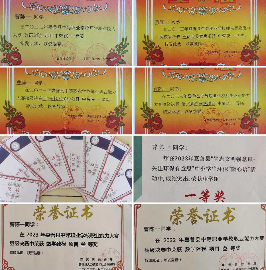 三年來,除了在學(xué)習(xí)上,曹陳一不放過任何提升自我的機會,在很多舞臺上都能看到他的身影。他積極參與各類活動,在縣環(huán)保“微心語”優(yōu)秀作品評比、英語朗誦、數(shù)學(xué)建模、電子小制作等比賽中榮獲佳績,年年被評為“學(xué)習(xí)標兵”,深受老師和同學(xué)們的喜愛。