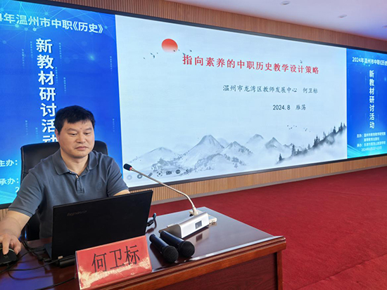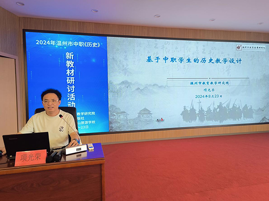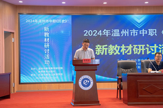 溫州中職歷史學科教師匯聚一堂,通過專家引領、經驗交流等方式共同研討新教材教學之道,樂清市雁蕩山旅游學校校長陳肖龍致歡迎辭。