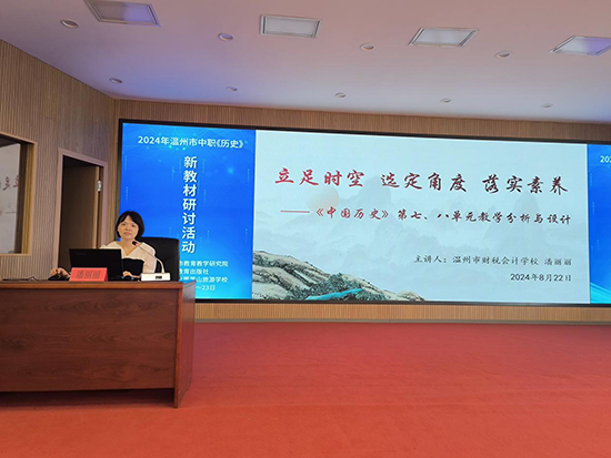 23日上午,樂清市雁蕩山旅游學校馮建平老師作《巧取課魂,合理建構——<中國歷史>第一、二單元教學分析與設計》經驗交流,溫州財稅會計學校潘麗麗老師作《立足時空,選定角度,落實素養——<中國歷史>第七、八單元教學分析與設計》經驗交流,兩位老師緊緊圍繞課標,從不同角度,深度解讀教材具體單元內容,針對相關教材內容,分享課時教學具體思路設計、歷史現象的關系邏輯等,幫助教師合理安排課程結構,確定教學重點和難點,以提高教學效果。