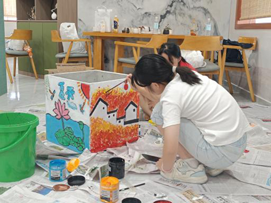 調研發(fā)現,村里老年人居多。故同學們討論后,從古鎮(zhèn)的歷史文化、民俗風情、自然風光等方面汲取靈感,選取傳統文化中的吉祥元素,結合現代審美和藝術手法進行二次創(chuàng)作,并制定了細致的工作計劃。為期五天的實踐活動如火如荼地展開了。