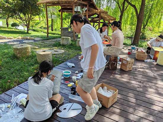 充分準備后,同學們開始花盆彩繪的實踐創(chuàng)作。為提高效率,他們分成工作小組,各自在村中找了一處靜謐的角落進行繪制。打形、調色、上色、勾線、落款……“藝小青”青春的身影與藍天白云、綠樹紅花交相輝映,成為伍浦村一道亮眼的風景線。