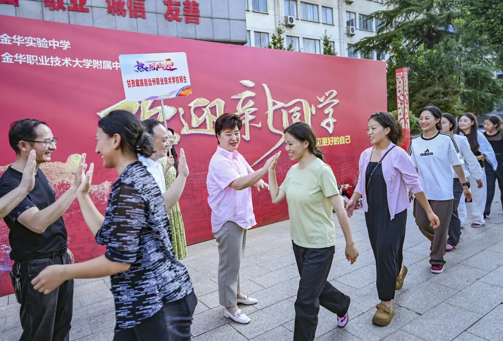 “歡迎你們來到金華實驗中學(xué)!”9月1日,一輛滿載著甘孜和婺城情誼的大巴車停靠在金華實驗中學(xué)(以下簡稱“實中”)校園內(nèi),婺城區(qū)教育局黨組成員、實中黨總支書記俞秀玲及校領(lǐng)導(dǎo)班子和車上走下來的37名學(xué)生一一擊掌。他們是金華市中職學(xué)校首批、實中首屆首批浙甘班學(xué)生,來自甘孜藏族自治州職業(yè)技術(shù)學(xué)校,當天跨越兩千多公里來到婺城,將在這里開啟新的求學(xué)之旅。