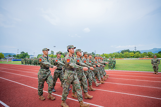 軍訓各位教官進行隊列展示。他們過硬的軍事素養、挺拔的英姿、整齊的步伐、響亮的口號,震撼鼓舞著每一位新生。