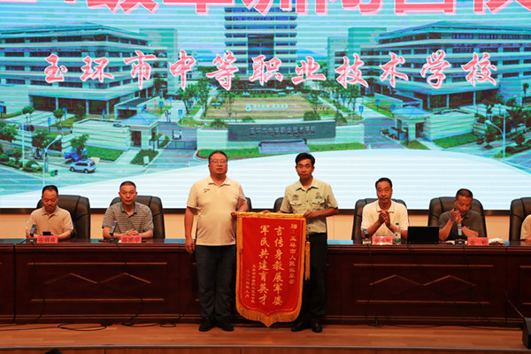 吳德章向王李靖贈送錦旗,感謝玉環(huán)市人武部對學(xué)校軍訓(xùn)工作的支持和幫助。