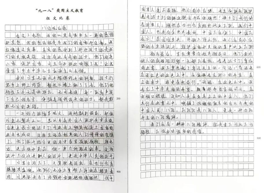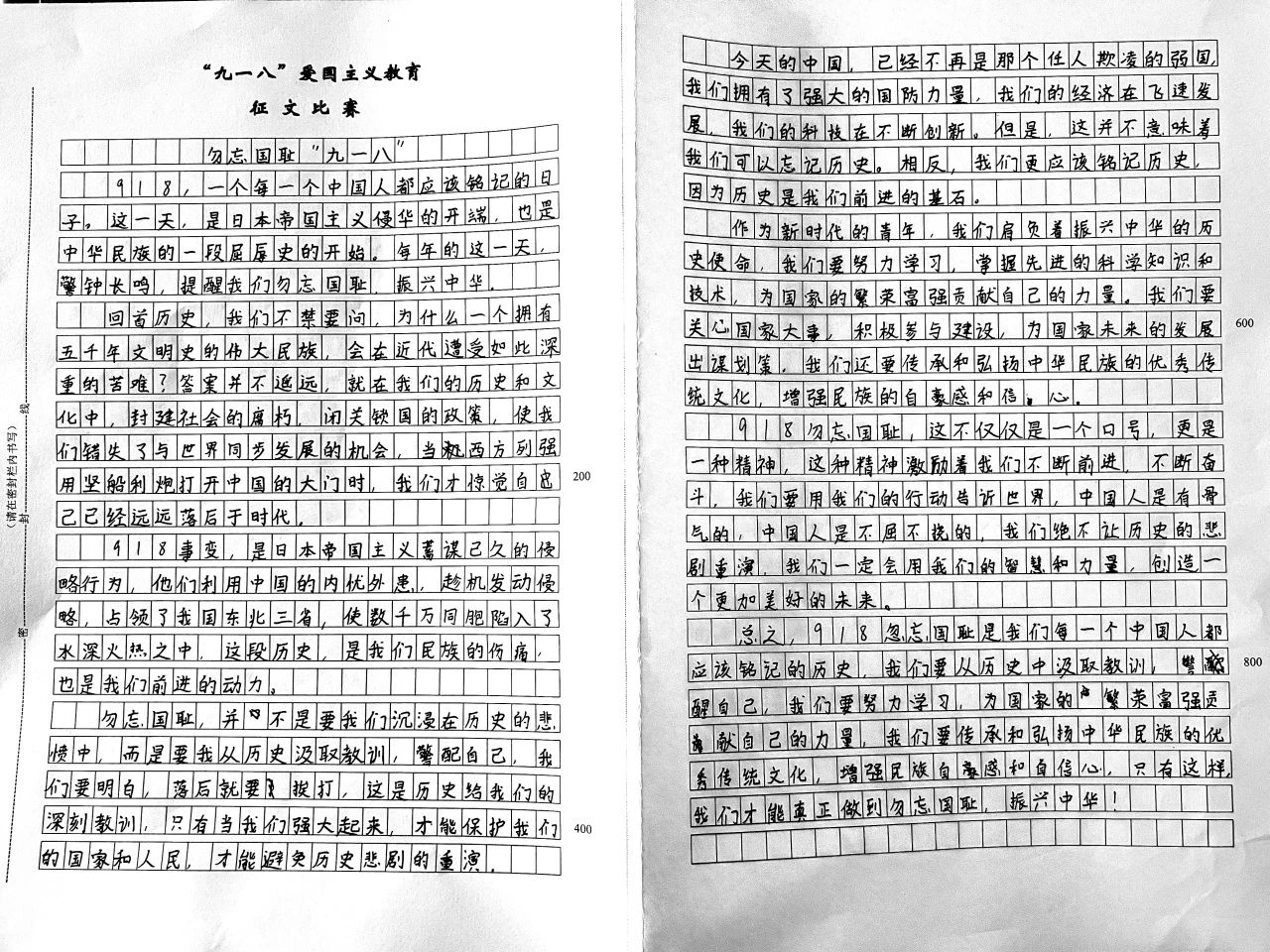 集體觀影后,團委和學生處聯合組織“九一八”愛國主義教育征文活動。