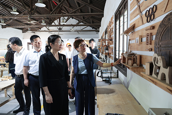 范曉春向調(diào)研組講述厚生絲廠悠久的歷史淵源,分享學(xué)校在歷史建筑保護(hù)與修繕?lè)矫娴淖龇āT谀咀鞴し唬瑥垨|和與正在進(jìn)行手工木工實(shí)訓(xùn)的學(xué)生親切交談,深入了解學(xué)生課程內(nèi)容結(jié)構(gòu),關(guān)注學(xué)生課堂安排,并親切叮囑操作過(guò)程中注意安全。