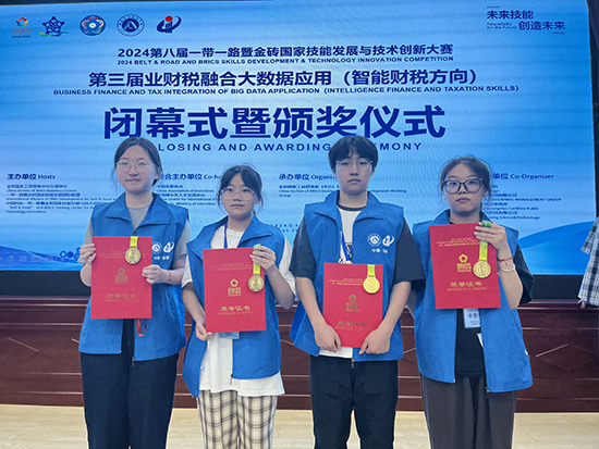 9月20日至9月22日,2024一帶一路暨金磚國家技能發展與技術創新大賽第三屆業財稅融合大數據應用(智能財稅方向)全國總決賽在安徽審計職業學院舉行。來自全國21個省市的36支隊伍同臺競技。海鹽職業教育中心俞唐天、彭煥媛、肖沁秀、李依婷四位同學代表浙江省參加全國總決賽。經過激烈角逐,該校四位同學以753.76的高分斬獲全國總決賽團體第一名,喜獲金牌。