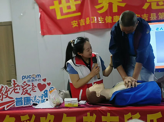 此次活動(dòng)共有68名老年人參加,鄭艷醫(yī)師重點(diǎn)分析了老年人自救和互救中常見的方法,她從老年人跌倒、噎食、氣道異物梗阻和心肺驟停急救等現(xiàn)場(chǎng)急救的知識(shí)逐項(xiàng)講解,再現(xiàn)場(chǎng)演示操作,最后,學(xué)員上臺(tái)體驗(yàn)心肺復(fù)蘇等現(xiàn)場(chǎng)急救過(guò)程。