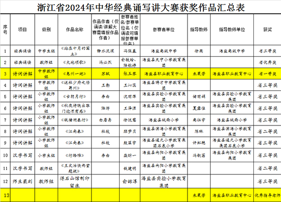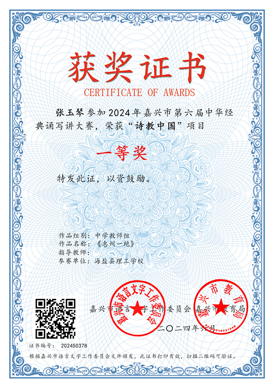近日,由教育部、國家語委主辦的全國性賽事——2024年中華經典誦寫講系列活動之“詩教中國”詩詞講解大賽(浙江賽區)結果揭曉。海鹽職業教育中心語文組張玉琴老師在朱菱芳老師的指導下,榮獲此項賽事中學教師組省級一等獎,并以嘉興市唯一名額晉級國賽。