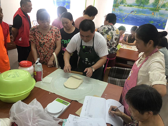在老年學(xué)堂,高級面點(diǎn)師王麗華老師精心準(zhǔn)備了面團(tuán)、餡料、手套、木餅印等材料和工具,并詳細(xì)介紹手工月餅的制作過程和動(dòng)作要領(lǐng)。老人們按照老師講解的步驟:揉面團(tuán)、包餡、放模具內(nèi)按壓成型,每一道程序都忙得不亦樂乎。大家一邊做月餅,一邊嘮家常,歡笑聲不斷。很快一個(gè)個(gè)精美可口的蘇式月餅就做好了。