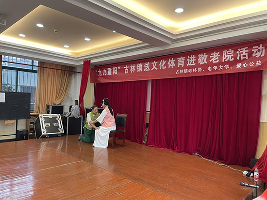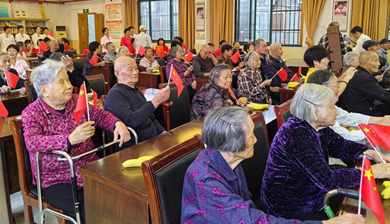 活動(dòng)開始時(shí),古林鎮(zhèn)老年大學(xué)太極拳班的學(xué)員們?yōu)槔先藗冋故玖死夏?6式楊式太極拳、觀音拳、功夫扇和木蘭扇等健身節(jié)目,并現(xiàn)場(chǎng)示范了一些簡(jiǎn)單的伸展動(dòng)作,如頸部伸展、肩部旋轉(zhuǎn)、手臂拉伸等。老人們認(rèn)真跟著一起做動(dòng)作,在溫暖親切的互動(dòng)中,一起體驗(yàn)運(yùn)動(dòng)的樂趣。接著,二胡班的學(xué)員們?yōu)槔先藗儷I(xiàn)上了歌曲《十五的月亮》,他們的演奏技巧嫻熟,音色悠揚(yáng),讓老人們陶醉在音樂的海洋中。此外越劇班、甬劇班的學(xué)員們帶來了經(jīng)典戲曲選段,他們唱腔婉轉(zhuǎn),表演細(xì)膩。聽著熟悉的旋律,老人們興奮地一起揮舞著手中的小國(guó)旗,開心地跟著哼起了小調(diào)。
