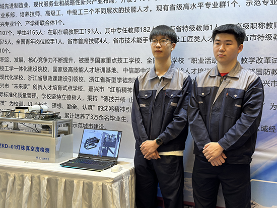 智能制造系展出燈珠真空度檢測儀及“天宮空間站”“古代炮車組合”“現(xiàn)代建筑”等車工、銑工作品。通過電腦展示燈珠真空度檢測儀的三維模型,吸引了眾多智能制造類企業(yè)駐足,彰顯了學生的創(chuàng)新與實踐能力。