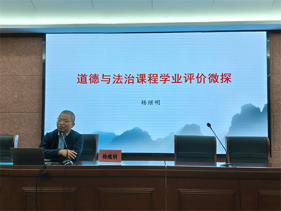 湖州市初中社會法治教研員楊繼明老師以《道德與法治課程學業評價微探》為題,為現場教師奉獻了一場內容豐富、深入淺出的講座。他從新課標的基本理念要求、新教材的總體特點思路展開,緊密結合教學一線實際需求,進行了詳盡剖析。
