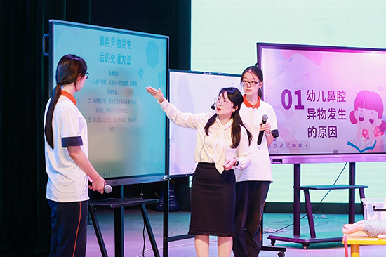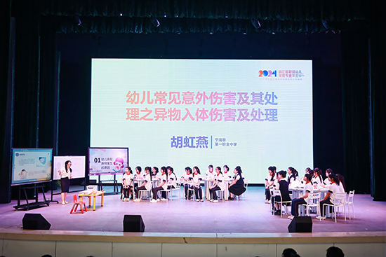 在“賽教融合課堂”觀摩環節,浙江省湖州藝術與設計學校的王云老師和企業導師曲海靜以雙師共導的形式開設了一堂《幼兒嘔吐癥狀的識別與處置》,寧海縣第一職業中學的胡虹燕老師則帶來了《幼兒常見意外傷害及其處理之異物入體傷害及處理》公開課。兩堂公開課亮點紛呈,教學方法兼具創新性與實用性。隨后,聽課教師就數字教學平臺和AI技術在教學的應用展開深入研討。