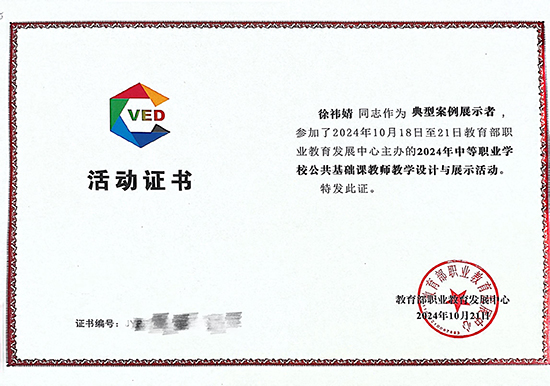 近日,由教育部職業(yè)教育發(fā)展中心主辦的2024年中等職業(yè)學校公共基礎課教師教學設計與展示交流活動在西安落下帷幕,全國共有1000多名教師參加展示活動。衢州第二中等專業(yè)學校徐祎婧老師在133位選手參加的思想政治組教學設計展示中表現(xiàn)優(yōu)異,獲得評委的一致好評,其參賽作品入選全國中等職業(yè)學校公共基礎課教師教學設計典型示范案例(一等獎)。